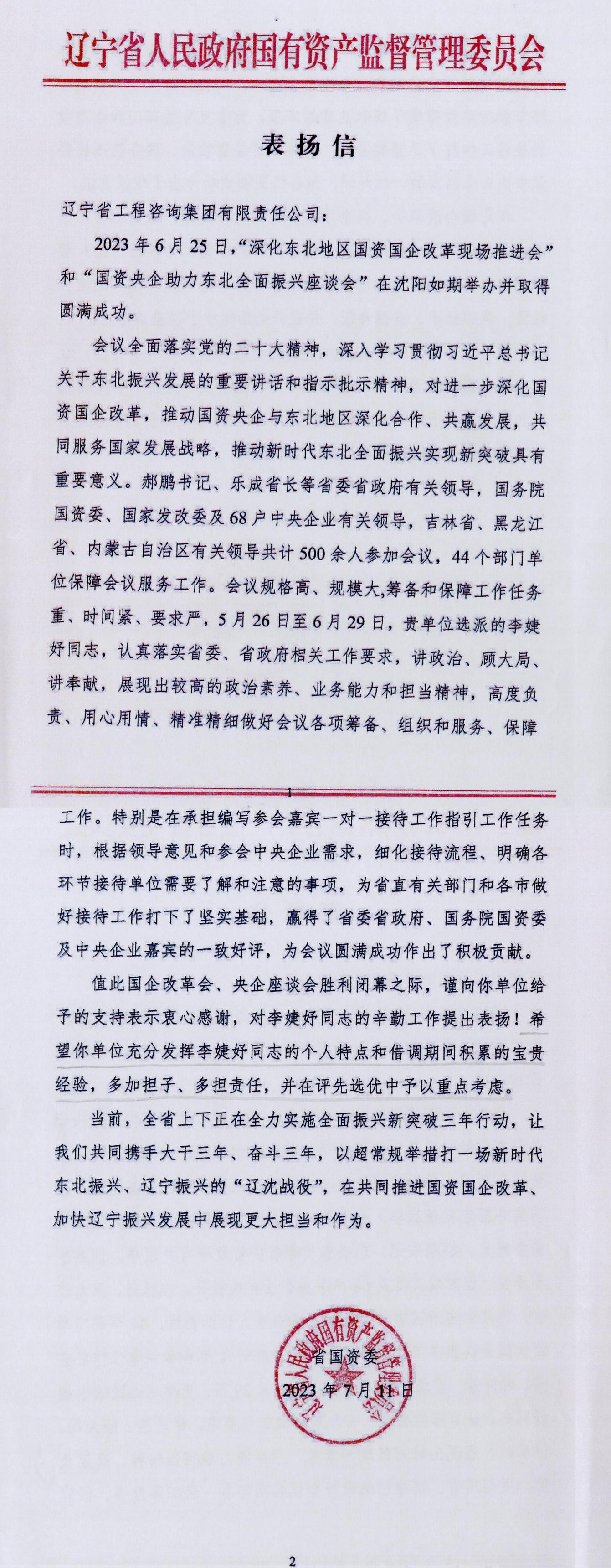 近日,公司选派李婕妤同志代表省工程咨询集团参加“”会和“”会的筹备组织和服务保障工作。工作期间该同志展现出较高的政治素质和业务素养,高质量完成了借调任务,赢得了各级领导和与会嘉宾的一致好评。